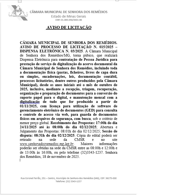 Aviso de Licitação n. 015/2025- Dispensa Eletrônica n. 003/2025- Contratação de Pessoa Jurídica para prestação de serviço de digitalização do acervo documental da Câmara Municipal de Senhora dos Remédios, incluindo toda a documentação física (pastas, ficheiros, livros de capa dura ou simples, encadernações, leis, documentação contábil, processos licitatórios, dentre outros produzidos pela Câmara Municipal), desde os anos iniciais até o mês de outubro de 2025, inclusive, mediante a recepção, triagem, recuperação, organização e preparação de documentos para a conversão do suporte papel para o digital, e manutenção mensal com a digitalização de tudo que for produzido a partir de 01/11/2025, com licença para utilização de software de gerenciamento eletrônico de documentos (GED) para consulta e controle de acesso via web, para guarda de documentos físicos em arquivos de segurança, com busca, sob o critério de menor preço global.