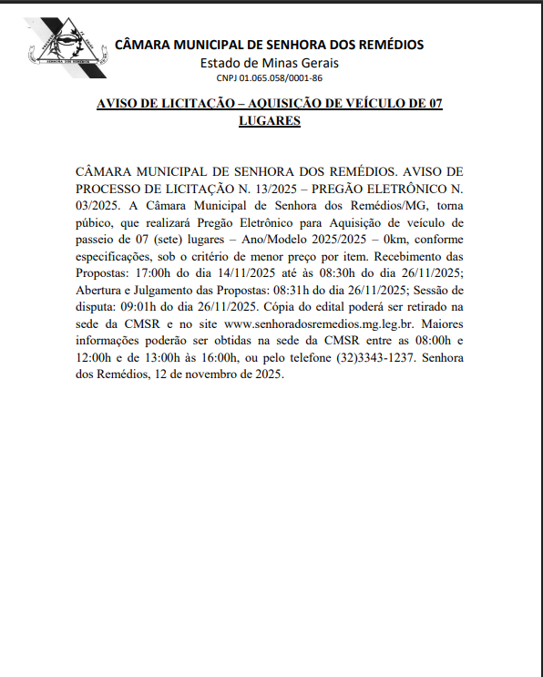 Aviso de Licitação n. 13/2025 – Pregão Eletrônico n. 03/2025- Aquisição de veículo de 07 (sete) lugares. A Câmara Municipal de Senhora dos Remédios/MG, torna público, que realizará Pregão Eletrônico para Aquisição de veículo de passeio de 07 (sete) lugares – Ano/Modelo 2025/2025 – 0km, conforme especificações, sob o critério de menor preço por item. Recebimento das Propostas: 17:00h do dia 14/11/2025 até às 08:30h do dia 26/11/2025; Abertura e Julgamento das Propostas: 08:31h do dia 26/11/2025; Sessão de disputa: 09:01h do dia 26/11/2025. Cópia do edital poderá ser retirado na sede da CMSR e no site www.senhoradosremedios.mg.leg.br. Maiores informações poderão ser obtidas na sede da CMSR entre as 08:00h e 12:00h e de 13:00h às 16:00h, ou pelo telefone (32)3343-1237. Senhora dos Remédios, 12 de novembro de 2025.